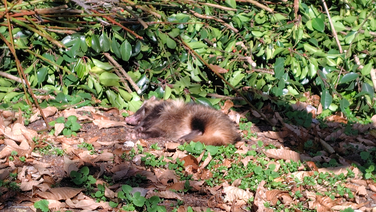 自然と動物裏庭に切った木の枝を重ねておいたら、たぬきが気持ちよさそうに昼寝していました。