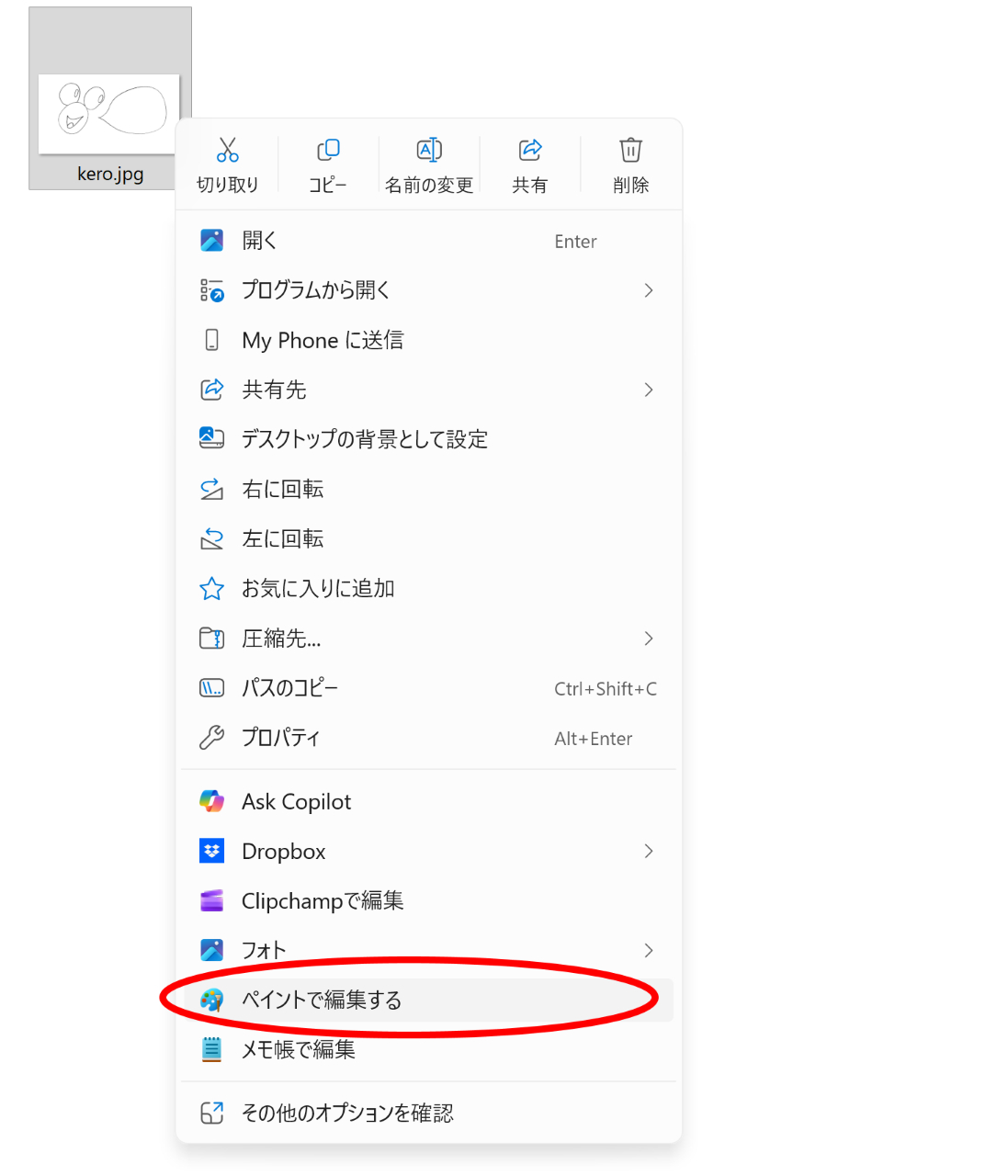 2.取り込んだ画像ファイルを右クリックして「ペイントで編集する」を選択して開きます。