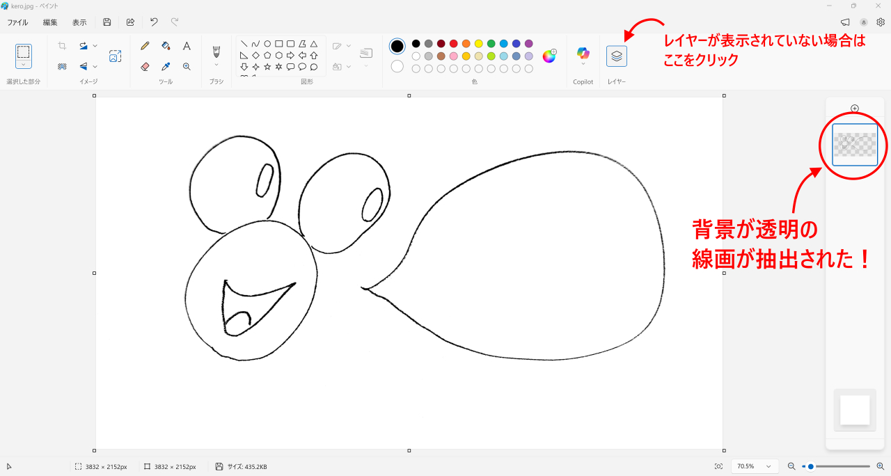 8.キーボードのCtrl+Vで画像を貼り付けます。この時点で手書きイラストの線画抽出できています。(レイヤーが表示されていない場合は、上のレイヤーボタンをクリックしてください)