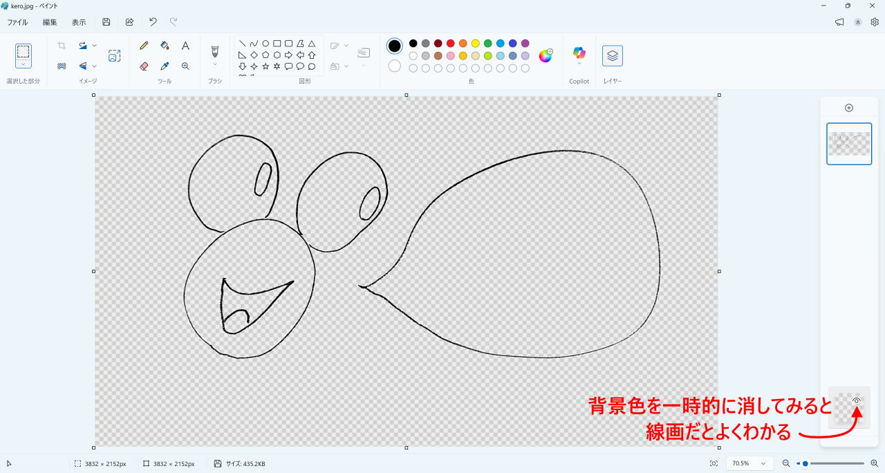 背景が白色のため、線画抽出できているのか分かりにくいですが、右下の背景ボタンの目のようなアイコンをクリックすると一時的に背景色が無効化されますので、線画抽出がよく分かります。