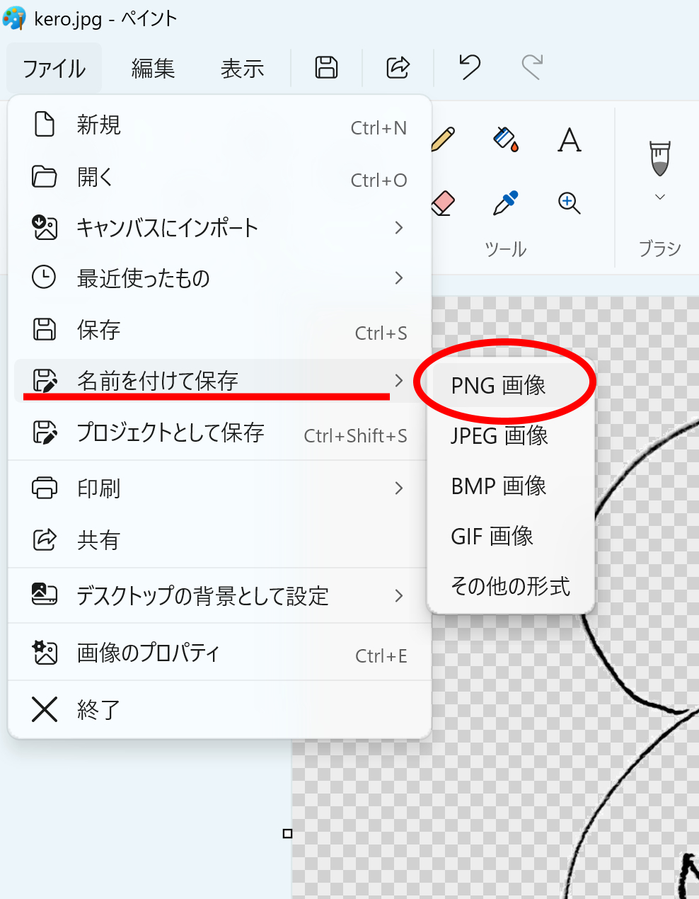 9.ファイルから、名前を付けて保存 → PNG画像 を選択すると背景色が透明の線画が画像ファイルとして保存できます。