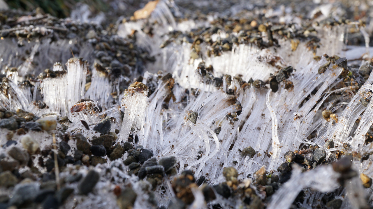 中には異様に長い霜柱もある。測ってみると10㎝以上もあった。