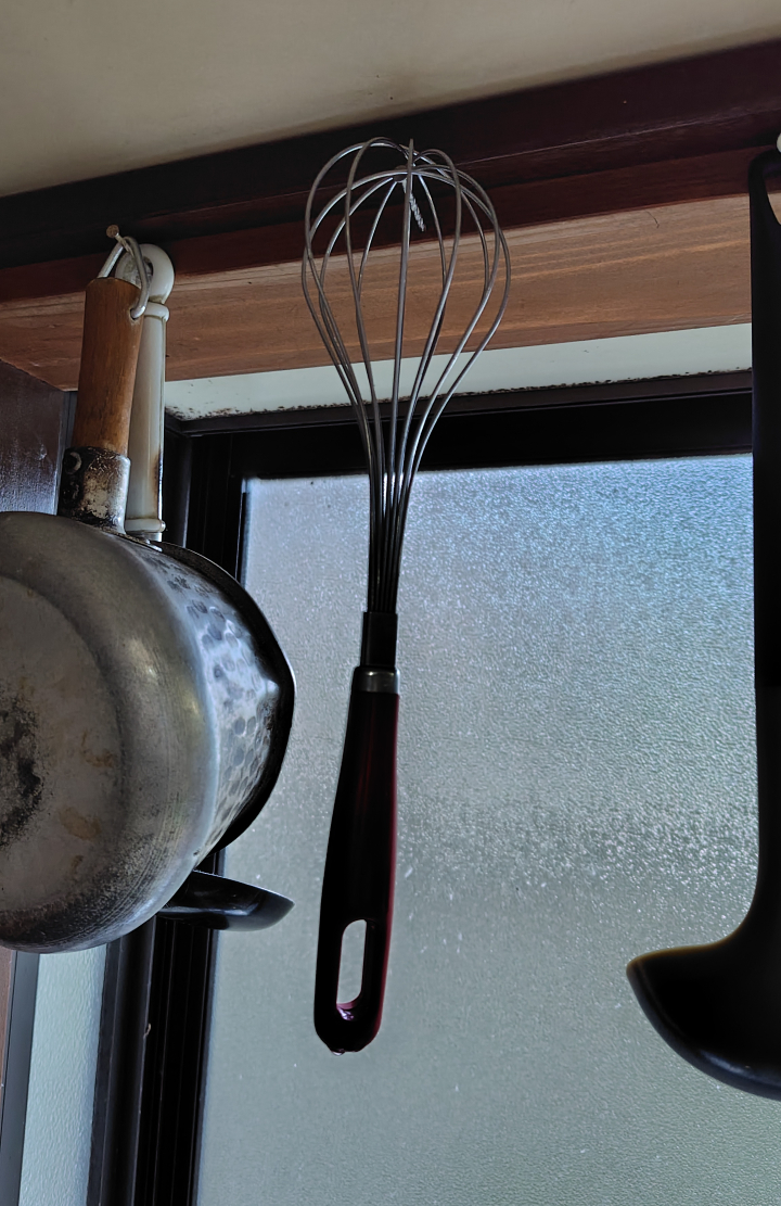 もし、台所に鍋やお玉などを掛けるためのが打ってあれば、写真の通り、泡だて器の頭を釘に引っ掛けるだけで楽に保管できる
