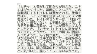「カチッ」と音がして明かりが消えた。ユキエはびっくりした。毎度のことながら、この自動消灯するトイレには驚かされる…