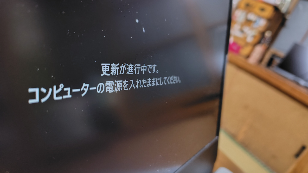 Windows Updateでは、こんなメッセージ画面が1分以上(場合によっては10分以上。最悪の場合このまま止まる場合あり)続いたりする。結構よくある。